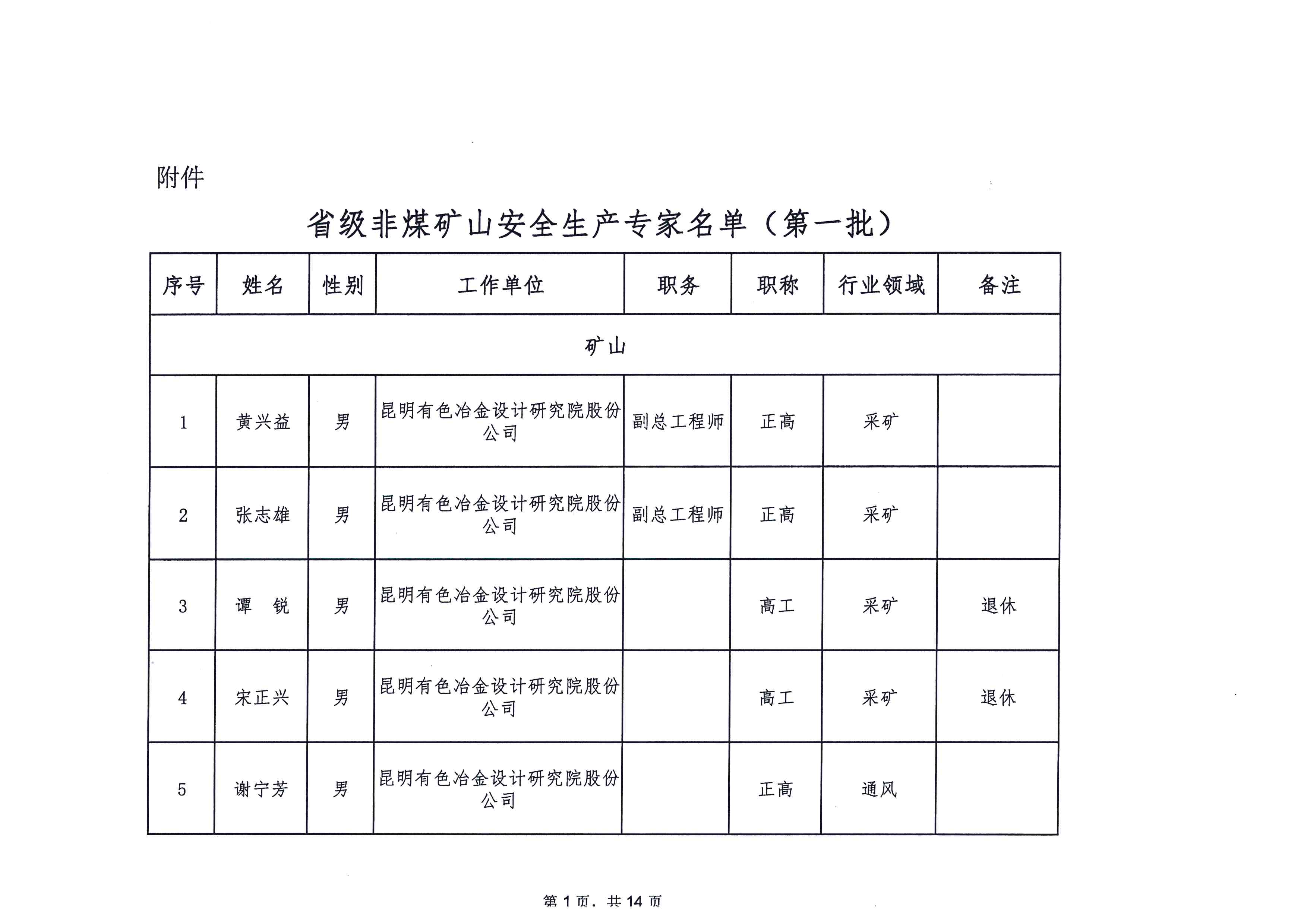 云南省应急管理厅办公室关于公布省级非煤矿山安全生产专家名单(第一批)的通知