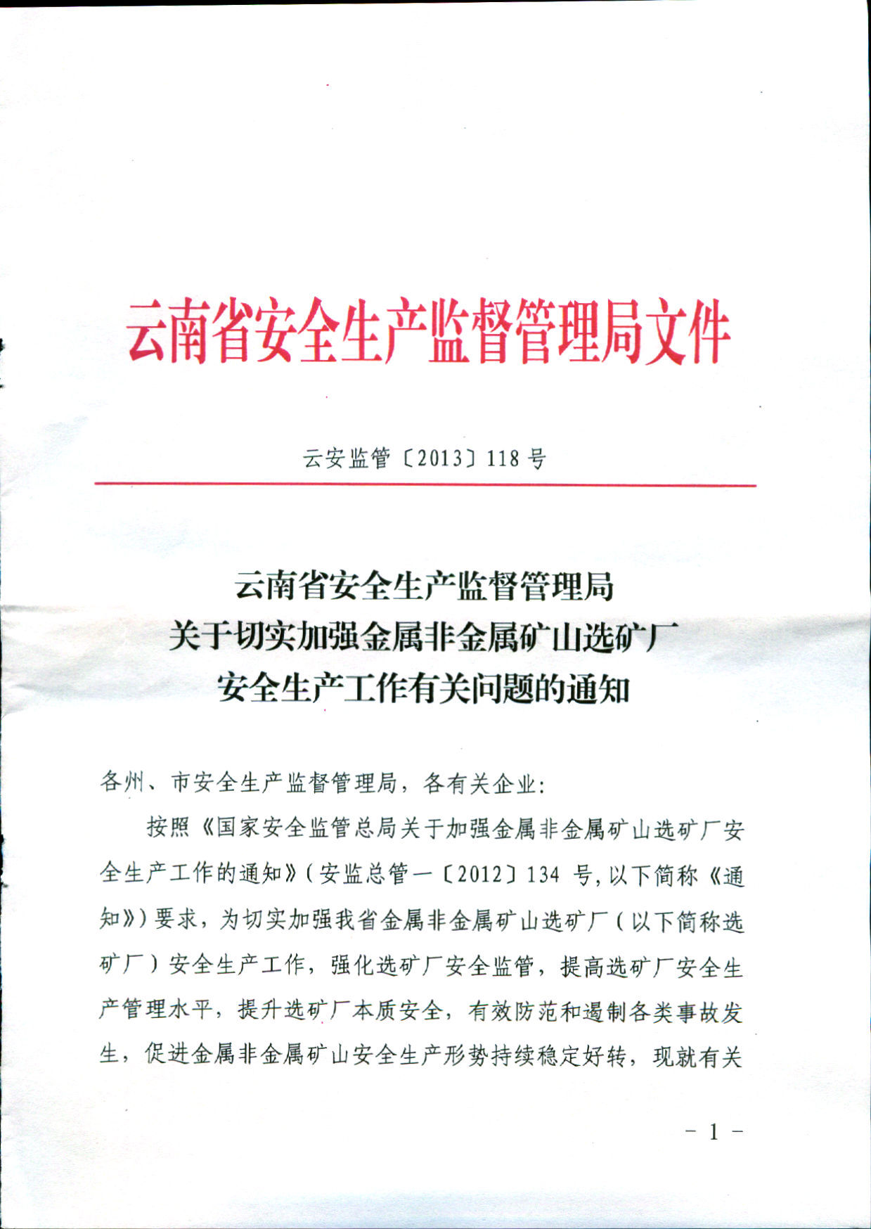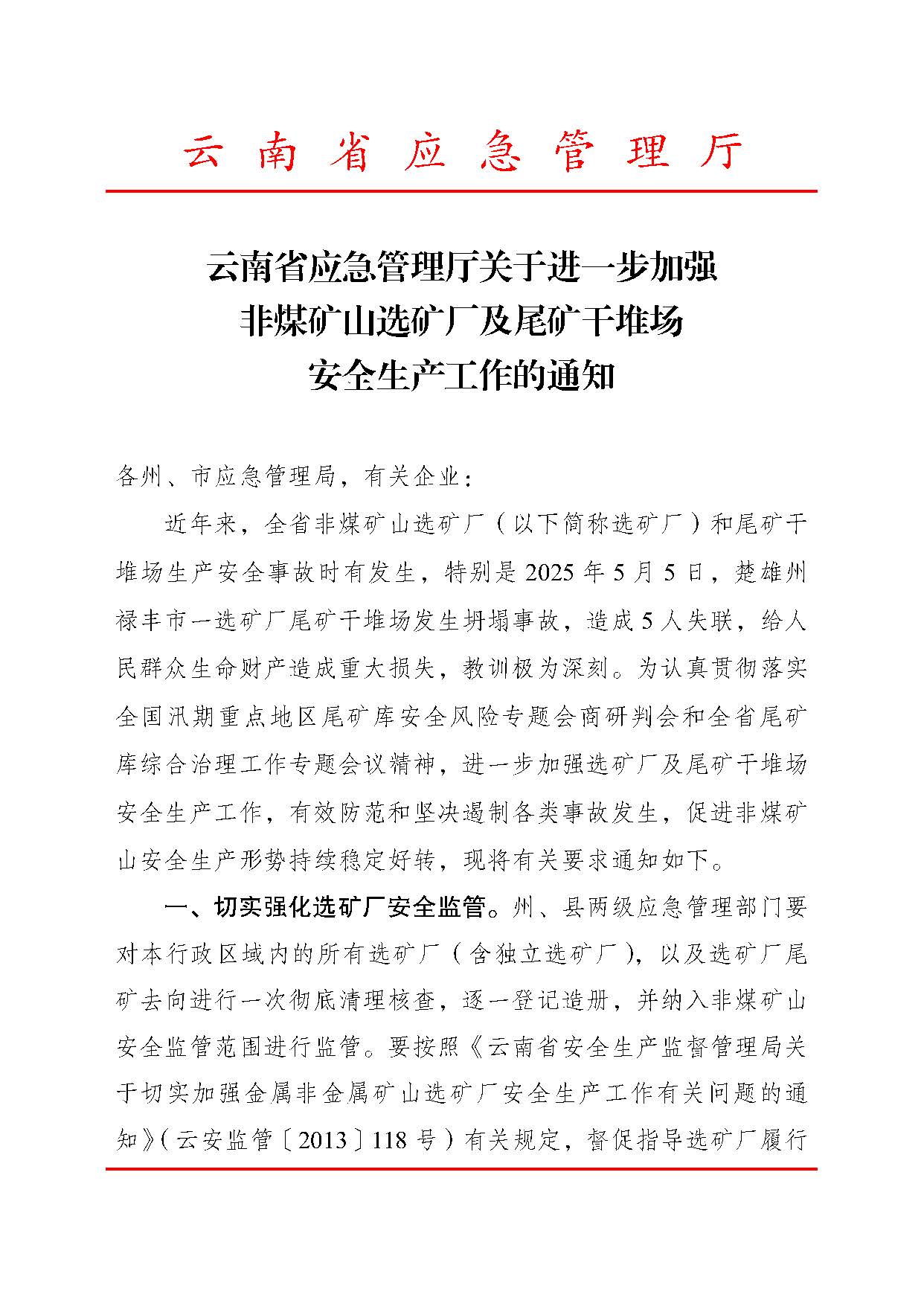 云南省应急管理厅关于进一步加强非煤矿山选矿厂及尾矿干堆场安全生产工作的通知